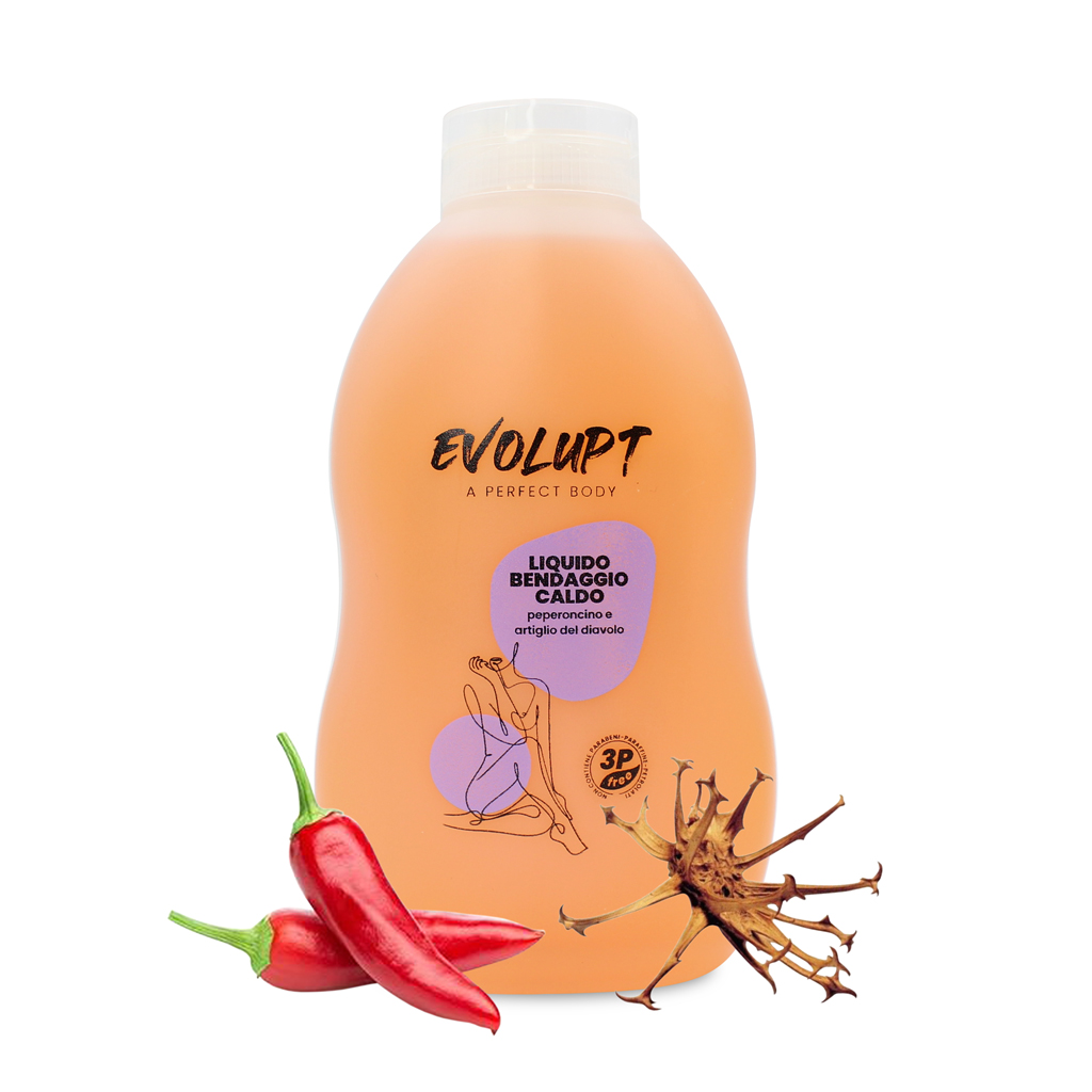 Prodotto di cosmesi naturale a base di peperoncino e artiglio del diavolo, il LIQUIDO BENDAGGIO CALDO Evolupt è una soluzione autoriscaldante da utilizzare per imbibire le fasce per i trattamenti di bendaggio corpo. Questo trattamento è specificamente formulato deale per combattere la cellulite e migliorare l’aspetto della pelle.